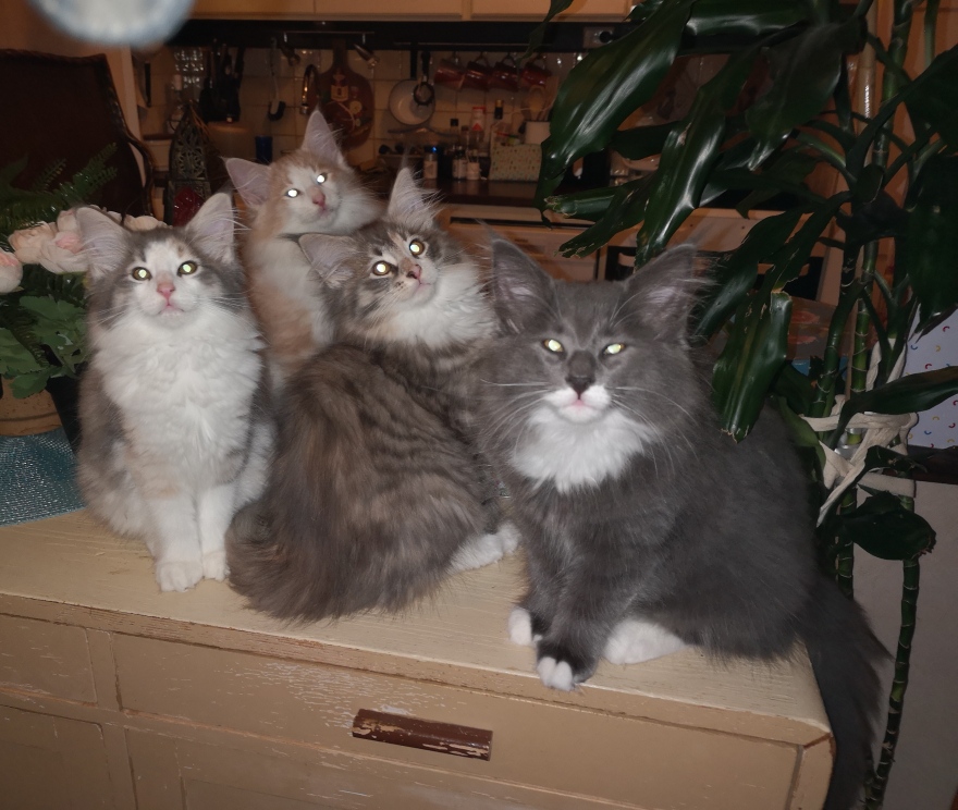 Minne & kullar R-kullen S* Guldskogen’s Ronya, (blåspotted bicolour) Rimaz, (cremetabby bicolour) Rianna, (blåspotted vit) Ricko, (blå-vit) Far; CH S* Tarjei’s BriceNFO d 09 24, rödspotted vit Mor; S*Guldskogen’s PepitaNFO g 09 24, blåsköldpaddspotted vit Sidor: 1 2 3 4 5 6